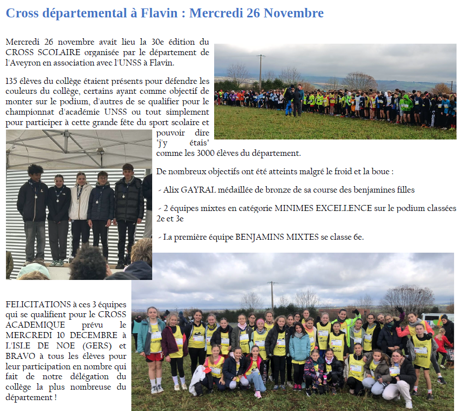 Bravo aux élèves qui ont participé au CROSS ACADEMIQUE à Flavin le 26 Novembre